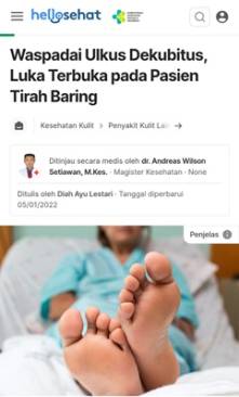 Baca Artikel Waspadai Ulkus Dekubitus, Luka Terbuka pada Pasien Tirah Baringhellosehat.comhttps://hellosehat.com/penyakit-kulit/kulit-lainnya/luka-dekubitus-pasien-tirah-baring/ | ||